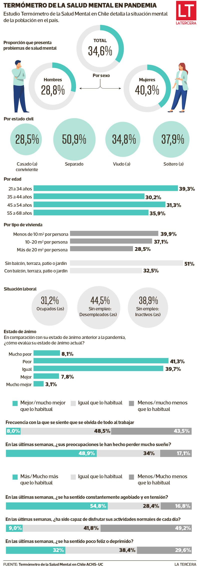 El estudio también muestra que los problemas de salud mental se manifiestan en mayor grado en el tramo de 21 a 34 años y en el grupo entre 45 a 54 años, con 39,3% y 35,9%, respectivamente, versus 30,2% del grupo de 35 a 44 años y 31,3%, de 55 a 68 años (ver infografía).