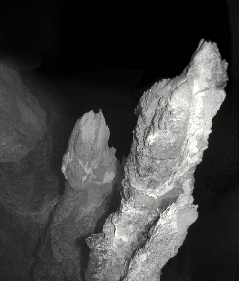 Sus paredes y columnas de carbonato cremoso parecen de un azul fantasmal a la luz de un vehículo operado por control remoto enviado a explorar.