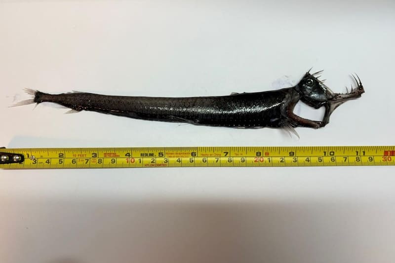 Durante una toma de muestras, los científicos hicieron un hallazgo inesperado: un pez abisal fue capturado por el lander a 5.600 metros de profundidad. Se especula que la criatura es un pez víbora del género Chauliodus, perteneciente a la familia Stomiidae. La especie, característica por su enorme mandíbula, es el pez con los dientes más grandes en relación con el tamaño de su cabeza.