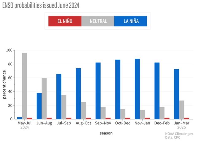Según la Noaa, en este momento hay muchas posibilidades de que La Niña esté presente para influir en el pico de la temporada de huracanes en el Atlántico. Incluso si la transición ocurre más lentamente, las probabilidades de que La Niña esté presente para el invierno del hemisferio norte (verano hemisferio sur) siguen siendo del 85 por ciento, lo cual es similar al pronóstico de la Noaa en meses anteriores.
