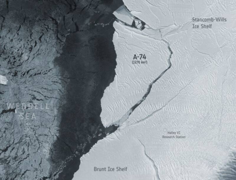 Esta última grieta fue monitoreada de cerca por imágenes de satélite, ya que se vio cortando rápidamente la plataforma de hielo. Los datos recientes de velocidad de la superficie del hielo derivados de los datos de Sentinel-1 indicaron que la región al norte de la nueva grieta es la más inestable: se mueve alrededor de 5 m por día. Luego, en las primeras horas del viernes 26, la grieta más nueva se ensanchó rápidamente antes de finalmente liberarse del resto de la plataforma de hielo flotante.