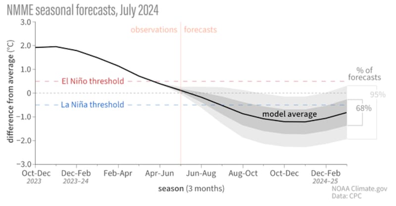 “El equipo de pronóstico anticipa que la transición ocurrirá antes (agosto-octubre). Esto se apoya, en parte, en la continuación de las temperaturas subsuperficiales del océano por debajo del promedio y los pronósticos a corto plazo que sugieren un resurgimiento de las anomalías de los vientos del este en julio”, sostiene el informe de la Noaa.