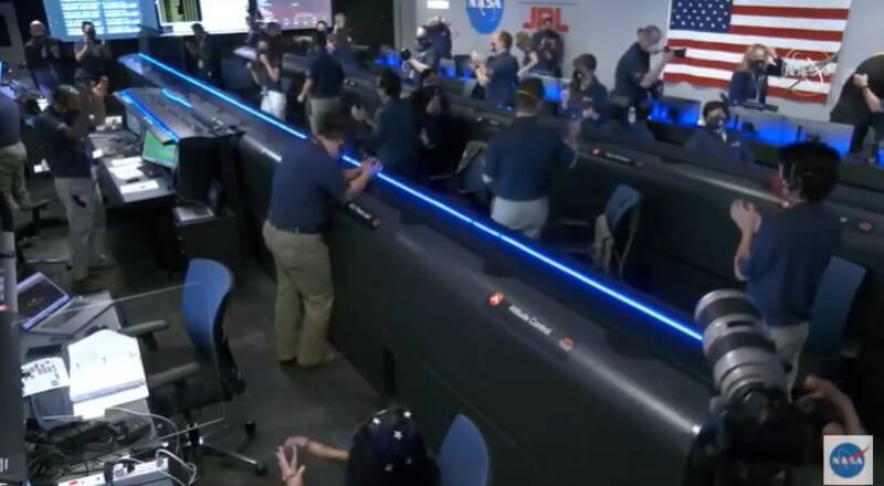La imagen fuer recibida con aplausos y felicitaciones por el equipo de control en tierra del Jet Propulsion Laboratory (JPL), que ha seguido segundo a segundo el vertiginoso proceso de entrada en la atmósfera y llegada al suelo en tan solo siete minutos.