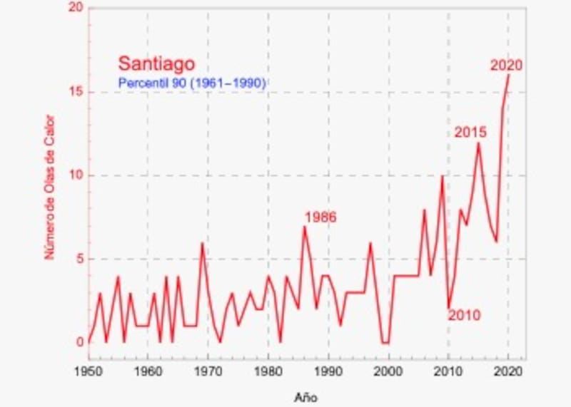 Como consecuencia del calentamiento global, “la frecuencia se ha triplicado en las últimas cuatro décadas. Incluso, durante la última década se registraron más de seis olas de calor en promedio por año, y en 2020 se rompieron todos los récords, registrándose un récord insólito de 16 olas de calor”, señala Raúl Cordero, climatólogo de la Universidad de Santiago.
