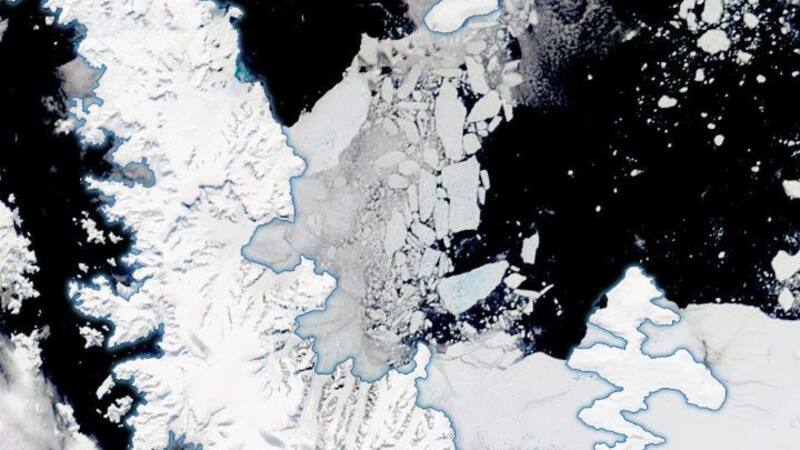 El espectrorradiómetro de imágenes de resolución moderada (MODIS) en los satélites Terra y Aqua de la NASA capturó imágenes entre el 16 y el 26 del primer mes del año de la bahía y la plataforma de hielo Larsen B acreditando y confirmando el colapso.