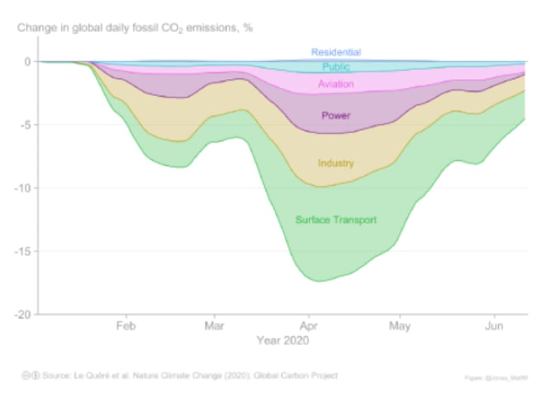 A principios de junio de 2020, las emisiones globales diarias de CO2 fósil se habían recuperado en su mayoría dentro del 5% (rango del 1% al 8%) en comparación con el mismo período en 2019, lo que muestra el rápido retorno de las emisiones, ya que muchos países aflojaron sus restricciones de confinamiento.