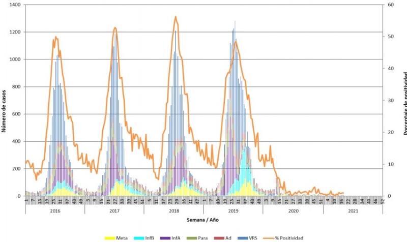 El Laboratorio de Infectología y Virología Molecular del Centro de Investigaciones Médicas de la Escuela de Medicina de la Universidad Católica, tiene un panorama similar. Para la semana 17 (26 de abril al 2 mayo 2021) y de acuerdo a la información de dos centros centinelas, las consultas por síndromes respiratorios se mantienen bajas, y representan el 0,7% del total de las consultas. El porcentaje de positividad de las muestras estudiadas de los virus no SARS-CoV-2 fue 0,65% (1/155).