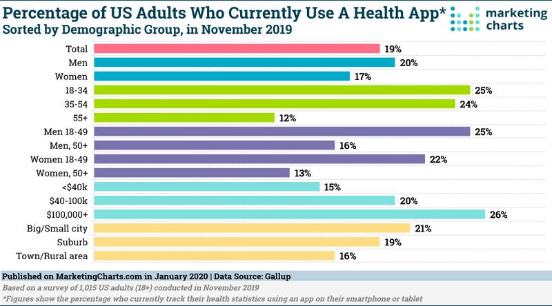 De acuerdo al estudio, los usuarios de aplicaciones de salud tienen más probabilidades de ser más jóvenes, y los adultos menores de 55 años tienen el doble de probabilidades (24-25%) que los de 55 años y mayores (12%) de usarlos.