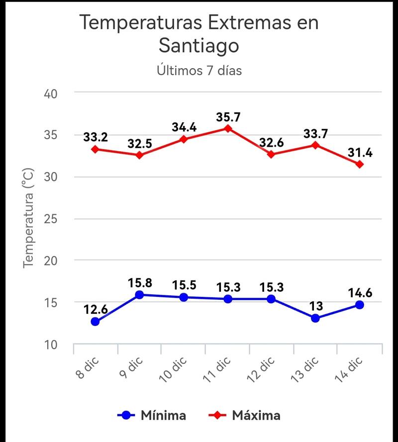 El último de éstos fue una ola de calor en Santiago, que se registró desde el 3 al 13 de diciembre, alcanzando 11 días consecutivos. Este evento climático rompió más de un récord. Inicialmente, cuando aún llevaba seis días, era la más extensa en diciembre desde que existe registro, igualando lo sucedido en 2019. Luego, al alcanzar siete días, se convirtió en la más larga para cualquier mes del verano meteorológico, aunque compartía el récord con febrero, también de 2019.