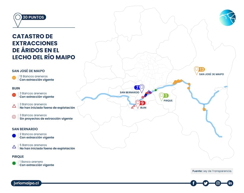 De acuerdo con el catastro hecho por la Junta de Vigilancia del Río Maipo primera sección (JVRM), gracias a la información entregada por las distintas municipalidades, actualmente, existen 30 proyectos de extracción de áridos con permisos activos entre San José de Maipo y Buin.