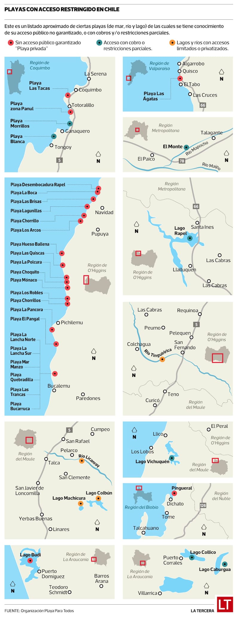 En el país, hay 954 playas de mar, lagos y ríos pero, cada lugar puede llegar a tener mucho más de un acceso, por lo que el problema de los accesos bloqueados no se limita a las playas de mar. Según estimaciones de Playa para Todos, en Chile hay entre 900 y 1.000 accesos públicos no garantizados.