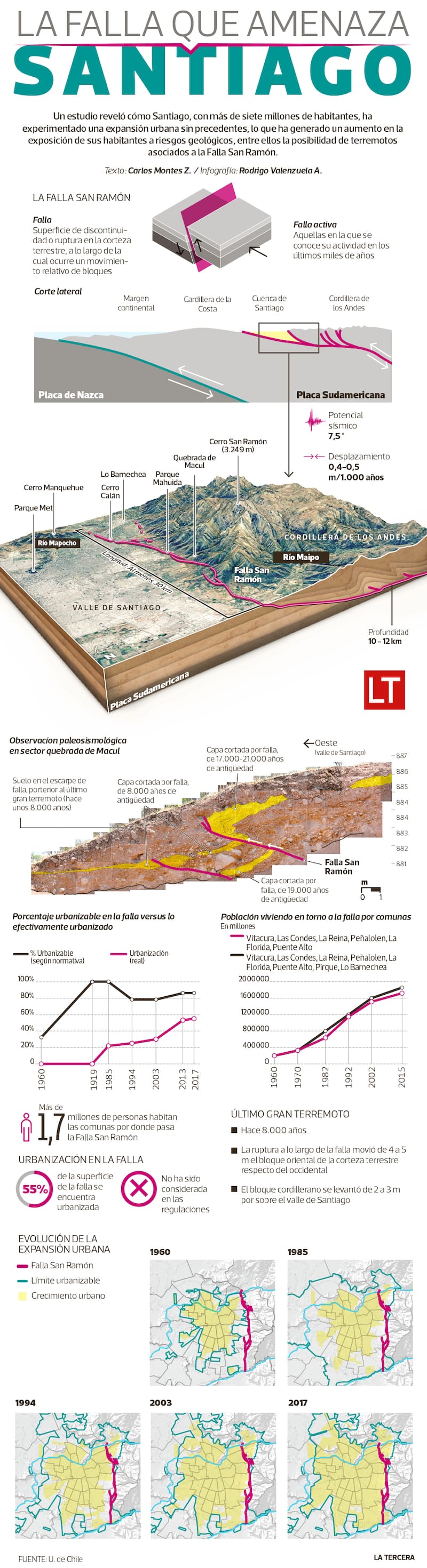 “El impacto potencial de un terremoto en la Falla de San Ramón es un tema de gran relevancia. Según los registros geológicos, esta falla ha generado al menos dos eventos sísmicos de magnitudes entre 7,2 y 7,4, ocurridos hace unos 8 mil y 17 mil años respectivamente. No obstante, aún no existe un consenso científico sobre si volverá a producir un suceso de tal magnitud”, explica el académico.