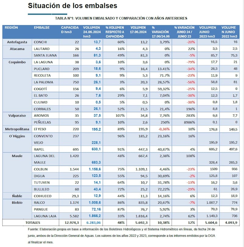 Si comparamos, señala el informe, los datos con a la misma fecha del año pasado, vemos que en general existe una leve mejoría en su conjunto, sin embargo, al analizar los embalses de la Región de Coquimbo, salvo el embalse Corrales que está en un 52% de su capacidad (y que en junio de 2013 tenía solo el 18%), el resto se encuentran por debajo de los niveles de junio de 2023.