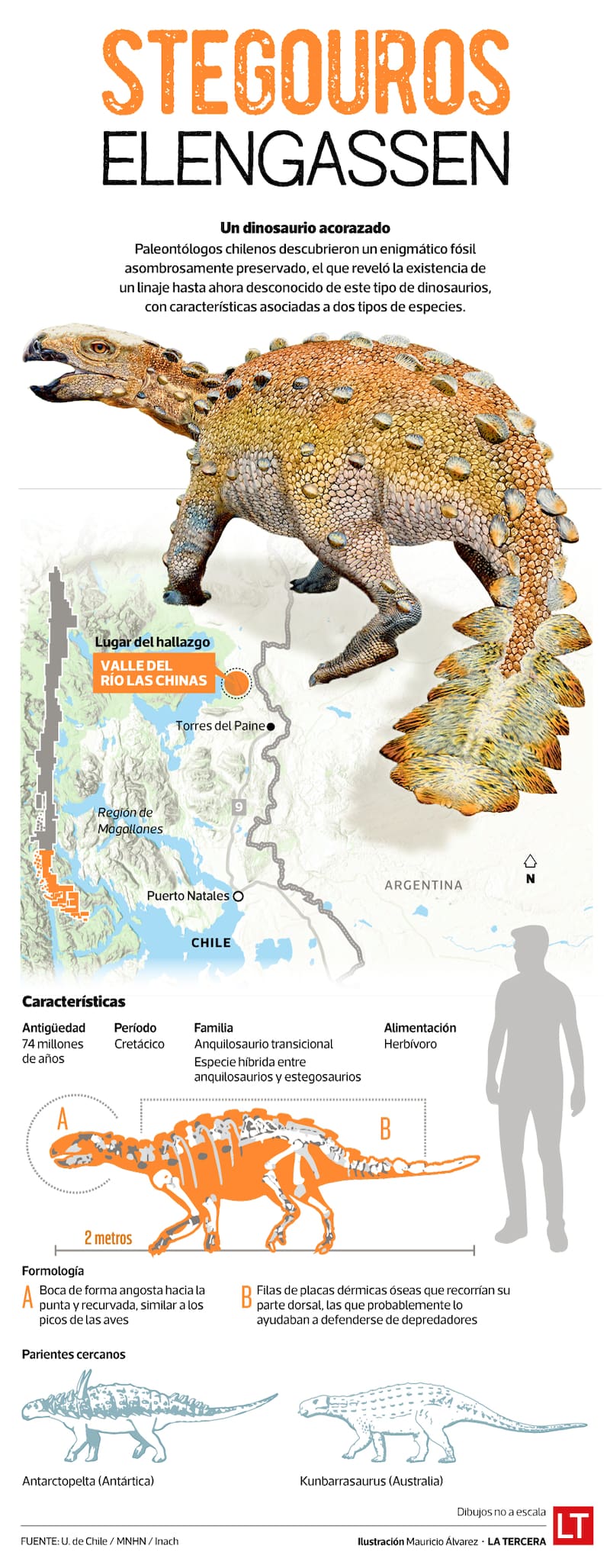 Estos descubrimientos no solo se han realizado en el norte de Chile. Uno de los más importantes yacimientos fósiles hoy está situado en la Patagonia, territorio donde fue encontrado el Stegouros elengassen, un nuevo tipo de dinosaurio acorazado que vivió hace 74 millones de años en una zona cercana a las Torres del Paine.