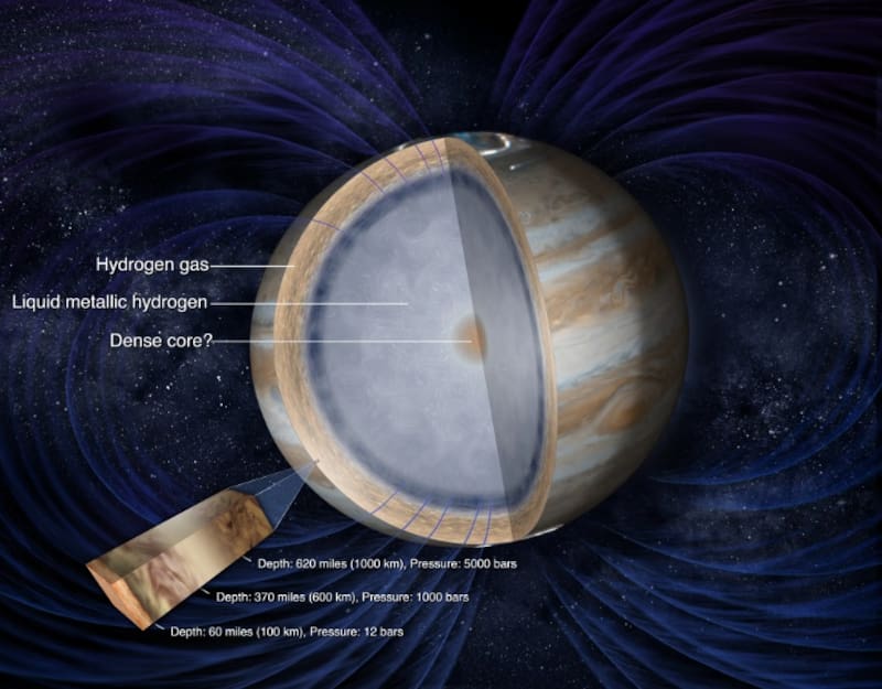 Finalmente, llegarías al núcleo de Júpiter, que es la región central del interior de Júpiter y no debe confundirse con una superficie.