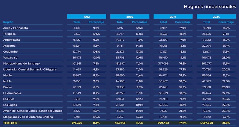 ¿Y qué ocurre con los hogares unipersonales? La tendencia que se ha observado en las últimas décadas es la disminución del promedio de personas por hogar, pasando de 4 personas por hogar en 1992 a 2,8 personas por hogar en 2024. Esta disminución se acompaña del aumento en el porcentaje de hogares unipersonales, desde 8,3% en 1992 a 21,8% en 2024. En resumen, si bien aumenta el número de hogares, estos tienen menos habitantes y son cada vez de menor tamaño.