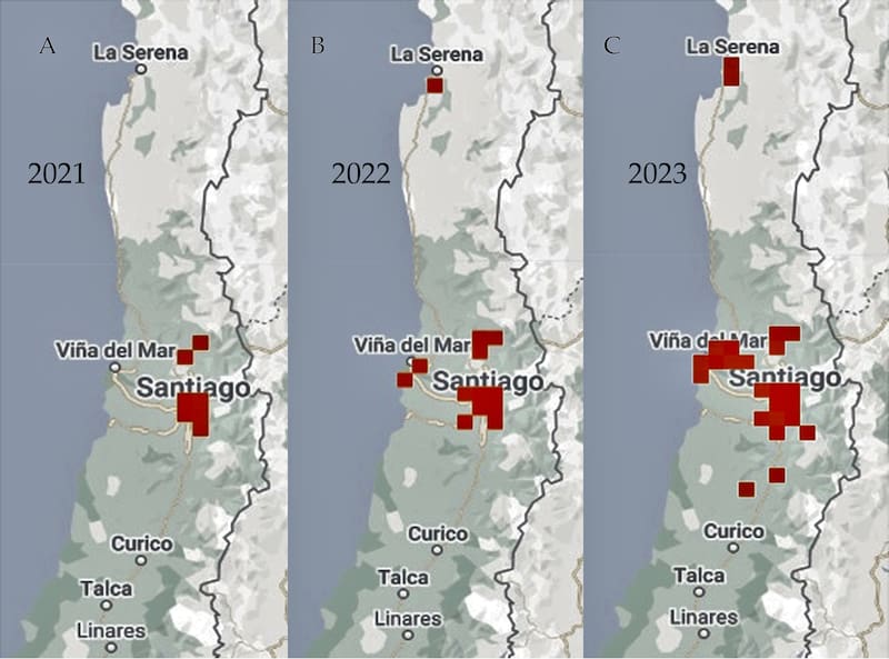 Según la investigación, la especie invasora, luego de tres años, ya llegó a la Región de Coquimbo en el norte y a la del General Libertador Bernardo O’Higgins en el sur, siendo la localidad de La Serena la más septentrional y San Vicente de Tagua Tagua la más meridional.