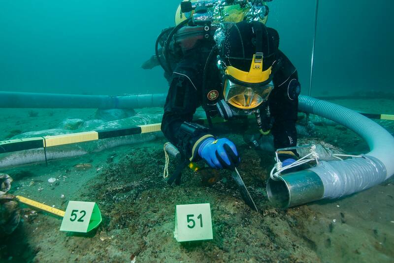 El trabajo de campo bajo el agua consistió en una excavación por estratos, aspirando los sedimentos que se despejan para luego recuperar los conjuntos de fauna en bloques junto con el sedimento que lo contiene.