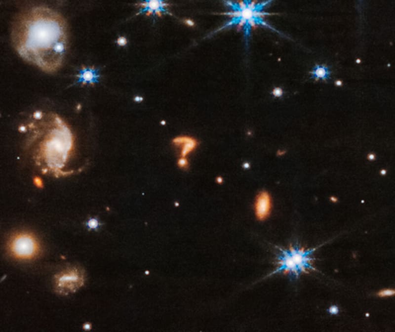 “Probablemente sea una galaxia distante, o galaxias potencialmente interactuantes (sus interacciones pueden haber causado la forma distorsionada del signo de interrogación)”, dijeron a Space.com representantes del Instituto de Ciencias del Telescopio Espacial (STScI) en Baltimore, que administra las operaciones científicas de JWST.