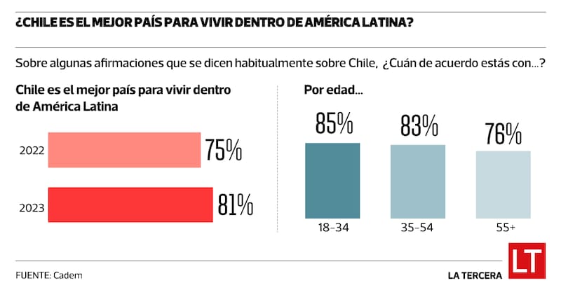 Cadem también analizó diferentes tipos de afirmaciones que se hacen sobre el país, y en el caso de: “Chile es el mejor país para vivir dentro de América Latina” un 81% está de acuerdo, incluso el segmento de 18-34 años es el más de acuerdo con un 85%, mientras que el segmento 55+ sólo con un 76%.