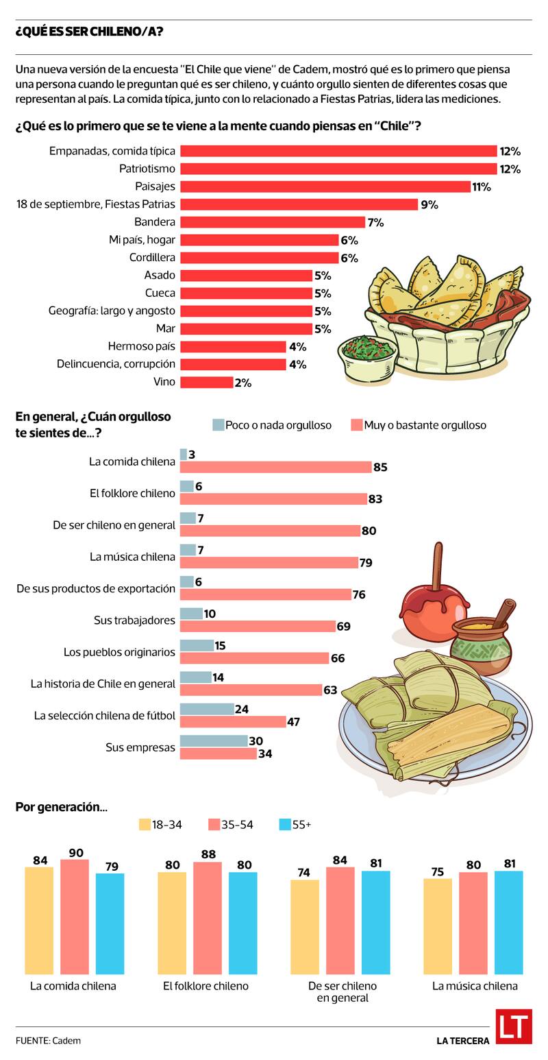 Lideraron las preferencias la comida chilena (85%), el folklore chileno (83%), ser chileno en general (80%) y la música chilena (79%). A diferencia del ítem de la Selección Chilena, que pasó de 74% de preferencias en 2019, a un 47% en 2023.