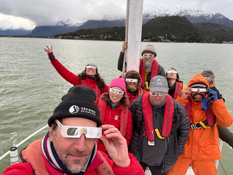 El equipo de científicos y científicas recorrieron en primer lugar distintos canales del sector, como el Martínez y el Baker, que son lugares que monitorean para estudiar los efectos del cambio climático. Revisaron los distintos sensores que tienen en el agua y tomaron muestras nuevas en la diversidad del fitoplancton que allí habita. Luego de eso se prepararon para estudiar el eclipse.