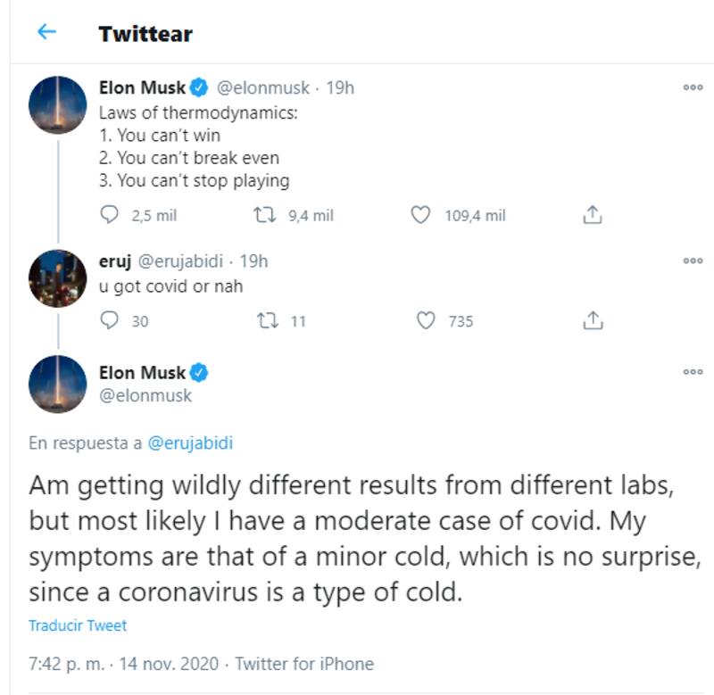 Respecto de los test que se realizó, Musk señala que los cuatro test que se realizó se hicieron el mismo día y con la misma máquina, pero aclaró que estaba a la espera del test PCR.