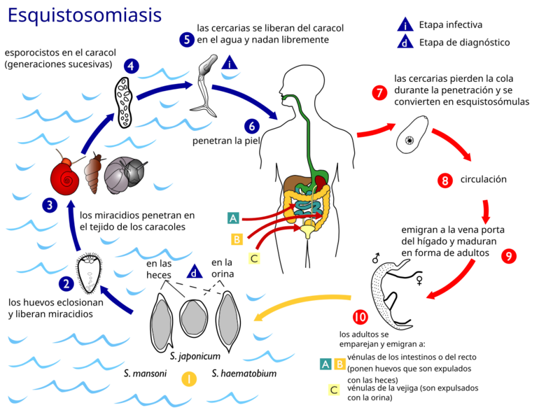 El parásito que causa la esquistosomiasis completa su ciclo de vida en dos huéspedes: primero en los caracoles y luego en mamíferos como las personas, los perros y los ratones. Los huevos de gusanos de agua dulce ingresan a los huéspedes humanos a través de la piel y circulan por todo el cuerpo, dañando múltiples órganos, incluidos el hígado, el intestino, la vejiga y la uretra. Cuando estas larvas alcanzan los vasos sanguíneos que conectan los intestinos con el hígado, maduran hasta convertirse en gusanos adultos. Luego liberan huevos que se excretan cuando la persona infectada defeca, continuando el ciclo de transmisión.