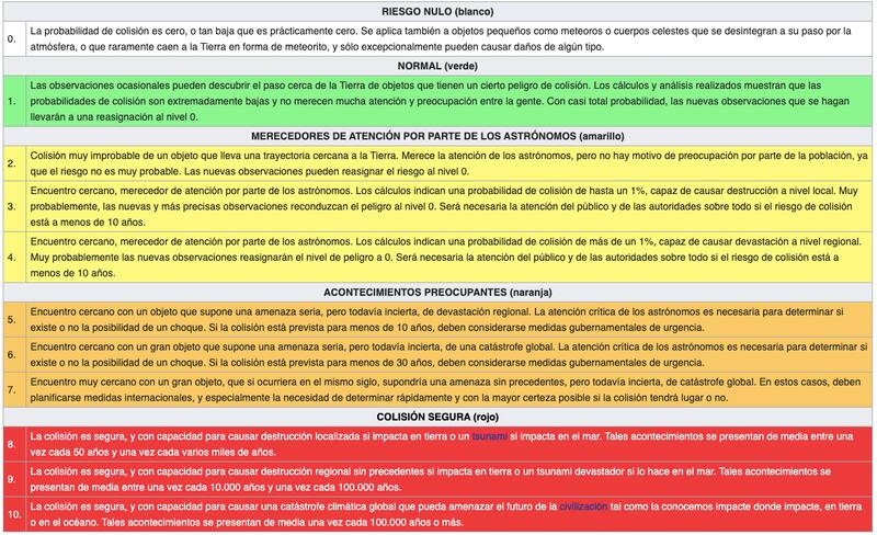 A diferencia de la Escala de Palermo, la Escala de Turín fue creada como un método más simple y didáctico -similar a la escala de Mercalli en sismología- para entender la peligrosidad de un eventual impacto contra nuestro planeta, combinando estadísticas y el potencial derivado de la energía cinética producida por el mismo impacto.