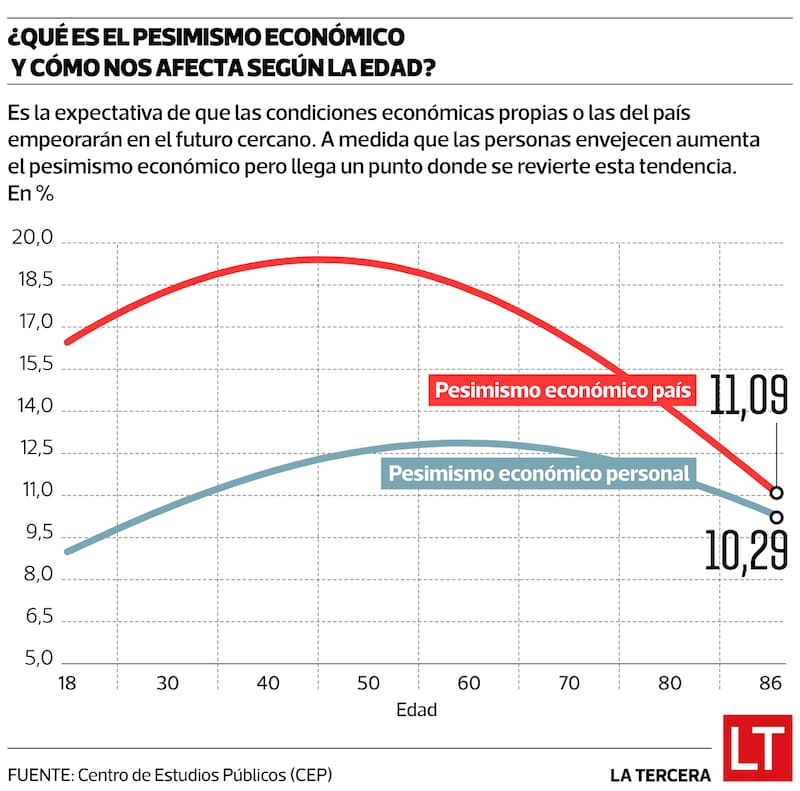 Los resultados arrojaron que con la edad las personas se vuelven más pesimistas, tanto del futuro del país como personal. Sin embargo, este incremento no es lineal: alcanza un máximo en la madurez, entre los 45 y 55 años, para luego descender. El menor pesimismo en la tercera edad es también diferenciado: los mayores de 65 años son menos pesimistas que los menores de 30 sobre el futuro económico del país, pero más pesimistas sobre su futuro personal.