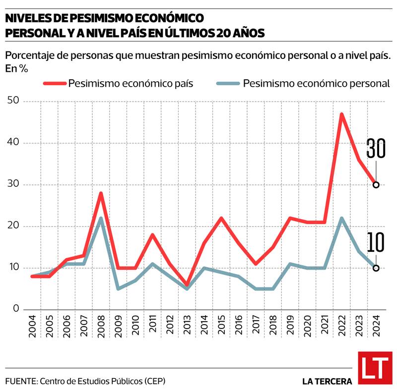 El pesimismo económico sobre el país es muy sensible a los períodos históricos, el cual aumenta en momentos de crisis y disminuye en los de bonanza, según detalla el estudio. A pesar de esta variación, la expectativa económica de los chilenos sobre el país se ha vuelto más pesimista, pasando de un 17% en 2001 al 30% en 2024. “El estancamiento económico de la última década, junto con la creciente inseguridad y desprestigio institucional podrían explicar este incremento”, dice la investigación.