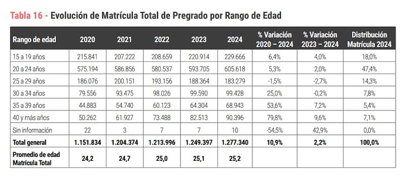 Su caso no es único. Según datos del Servicio de Información de Educación Superior (SIES) de la Subsecretaría de Educación Superior, el número de estudiantes de pregrado mayores de 30 años ha crecido de forma significativa en los últimos años. Solo entre los alumnos entre 30 y 34 años la cantidad de matriculados aumentó 23,8% entre 2015 y 2024, mientras que aquellos entre 35 y 39 años aumentaron 73,3%.
