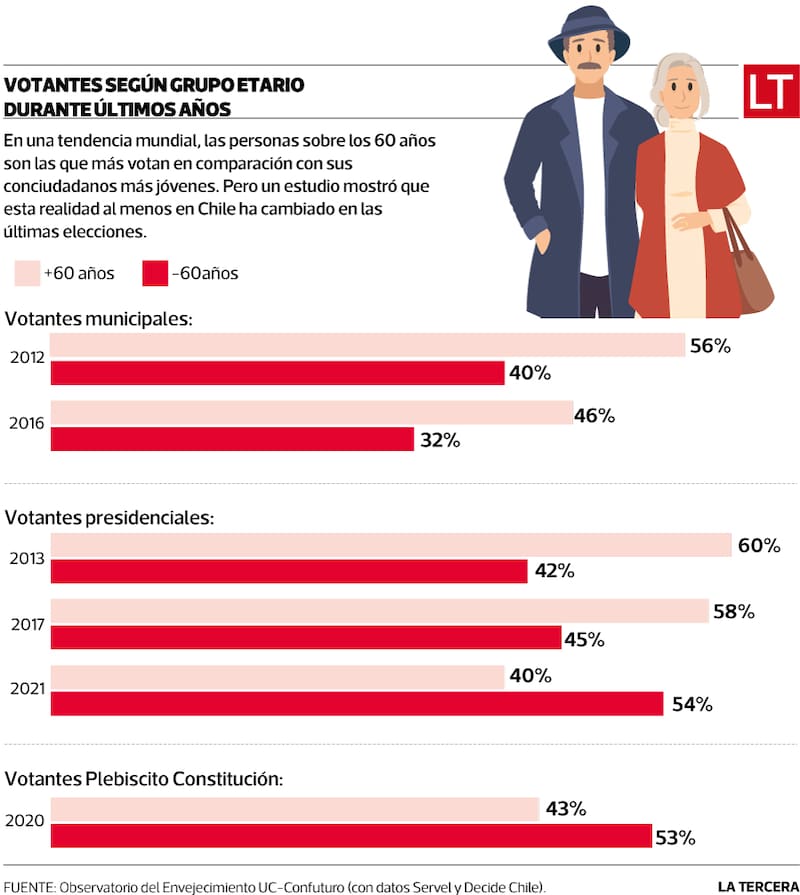 Sin embargo, en el plebiscito para una Nueva Constitución, realizado en octubre de 2020, los votantes 60+ representaron el 43% mientras que el grupo menor de 60 años tuvo una participación de 53%. Este cambio de tendencia se vio ratificado en las presidenciales de diciembre de 2021, cuando el 54% de las personas menores a 60 años votaron versus un 40% del grupo 60+.