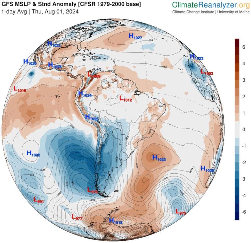 Según Cordero, sin considerar la Antártica, las presiones de ayer frente a las costas de Chile, fueron las más bajas en todo el hemisferio sur.