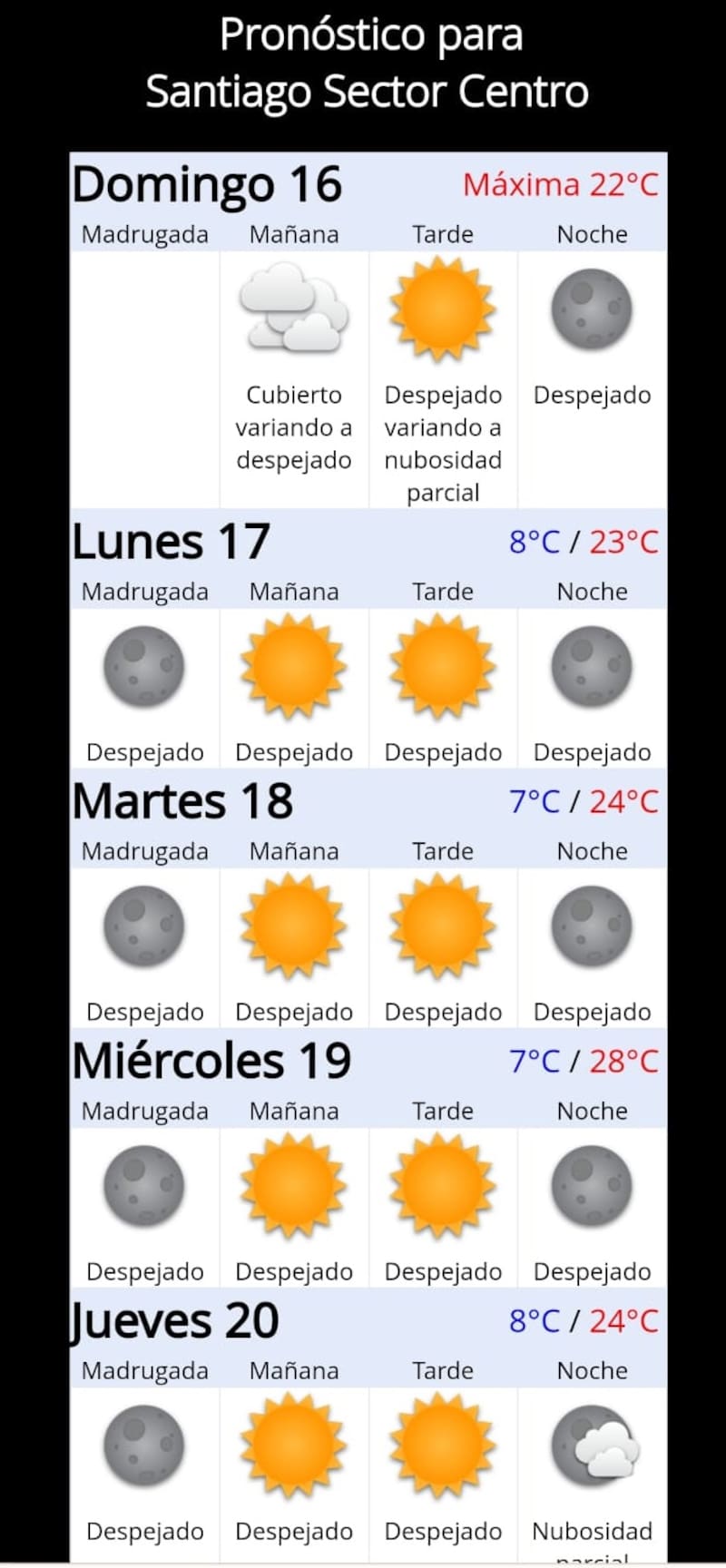 Sin embargo, y pese a estas temperaturas, las posibilidades de lluvias en Santiago siguen siendo muy escasas para los próximos días. Según la DMC, el lunes, martes, miércoles y jueves, se esperan cielos despejados, con temperaturas sobre los 23°C.