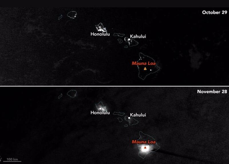 El fulgor del despertar del Mauna Loa, el volcán activo más grande del mundo, fue visible para los satélites de la Nasa y la Oficina Nacional de Administración Oceánica y Atmosférica de EE.UU. (NOAA, su sigla en inglés) que orbitaban a cientos de kilómetros sobre la superficie.