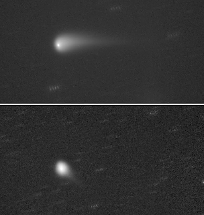 Sin embargo, ambos cometas eran difíciles de ver a menos que estuvieran situados bajo un cielo oscuro y sin contaminación lumínica. E incluso a través de buenos binoculares o un pequeño telescopio, ambos eran bastante tenues, apareciendo nada más que débiles y borrosas manchas de luz.