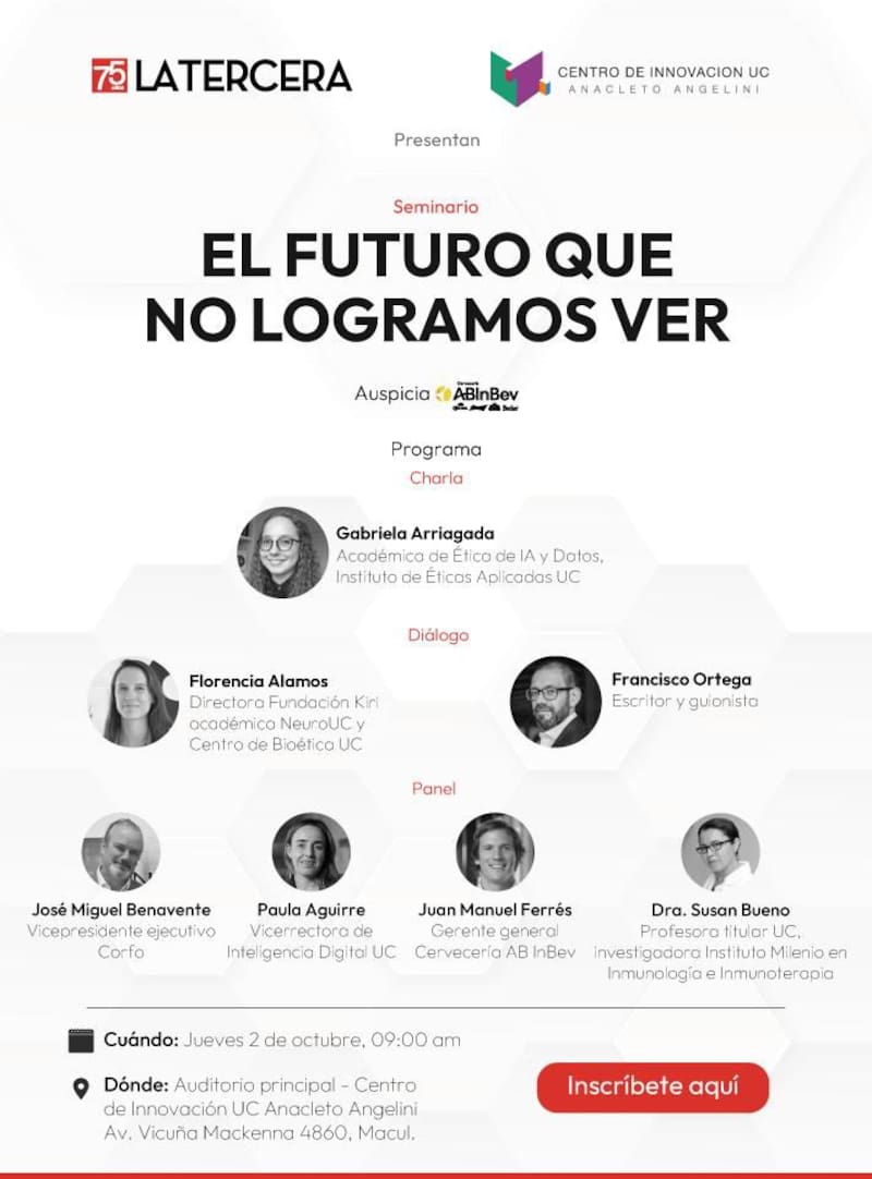 Finalmente, el seminario cerrará con un panel moderado por el periodista Francisco Aravena que integrarán José Miguel Benavente, vicepresidente ejecutivo de Corfo; Paula Aguirre, vicerrectora de Inteligencia Digital UC; José Manuel Ferrés, gerente general Cervecería Ab InBev y la doctora Susan Bueno, investigadora del Instituto Milenio en Inmunología e Inmunoterapia (IMII).