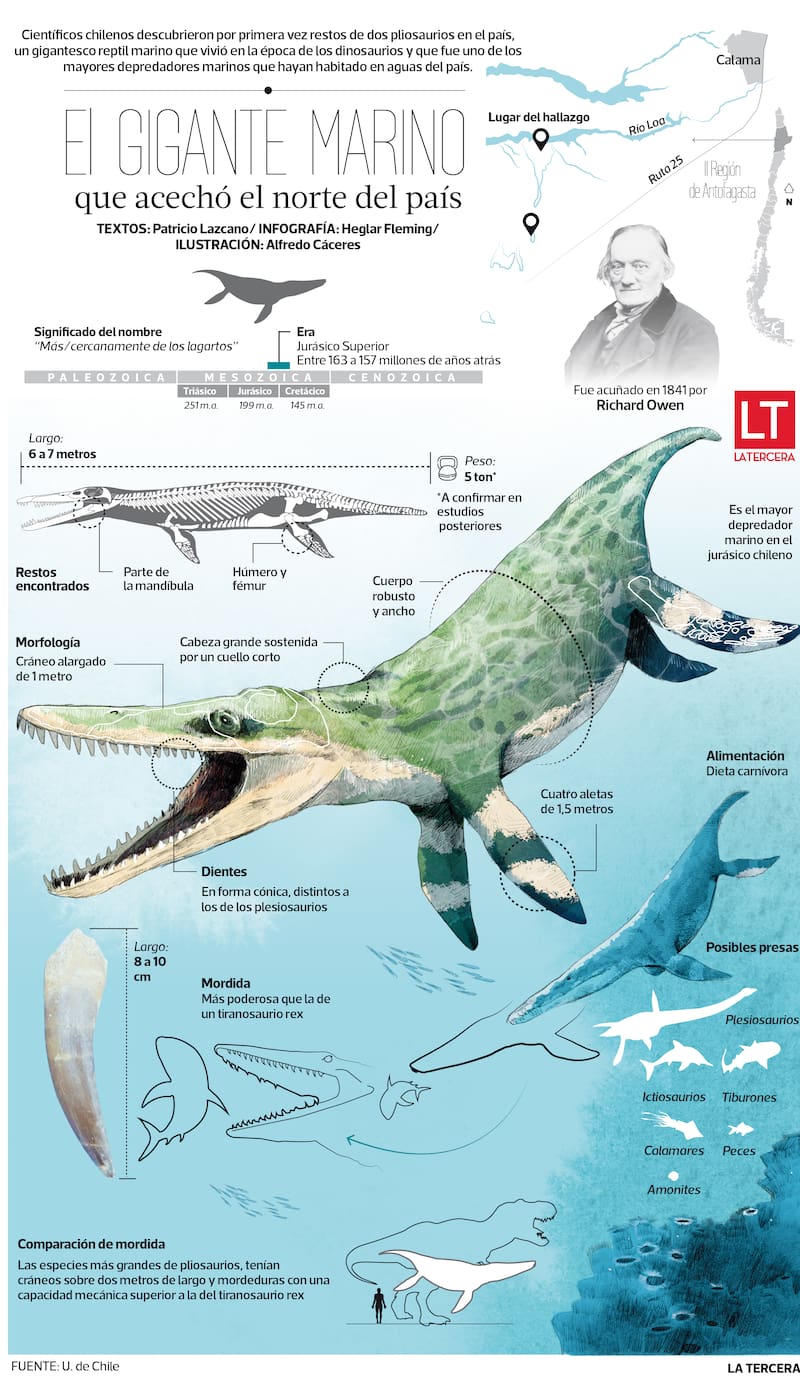 Explica que aunque no se trata del reptil marino más grande conocido en Chile, medalla que recae en el Aristonectes quiriquinensis, especie de más de 10 metros y que vivió en las costas de Chile central y de Antártica hace 66 millones de años, los restos de pliosaurio hallados en el norte "de todas maneras corresponden a un depredador importante en el ecosistema marino que existió en el norte de Chile durante el Jurásico Superior”.