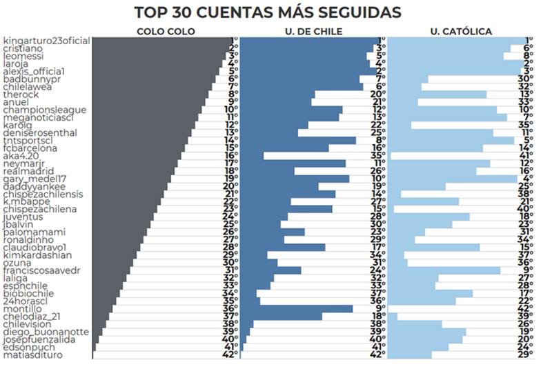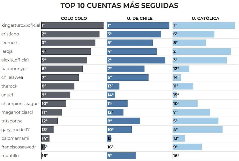 “Los seguidores de Colo Colo y U. de Chile tienen afinidades similares (figuras deportivas, artistas urbanos, y páginas de memes) mientras que los de la UC se diferencian por seguir en menor medida este tipo de cuentas, y más por seguir cuentas de ligas y clubes extranjeros”, explica Munita.