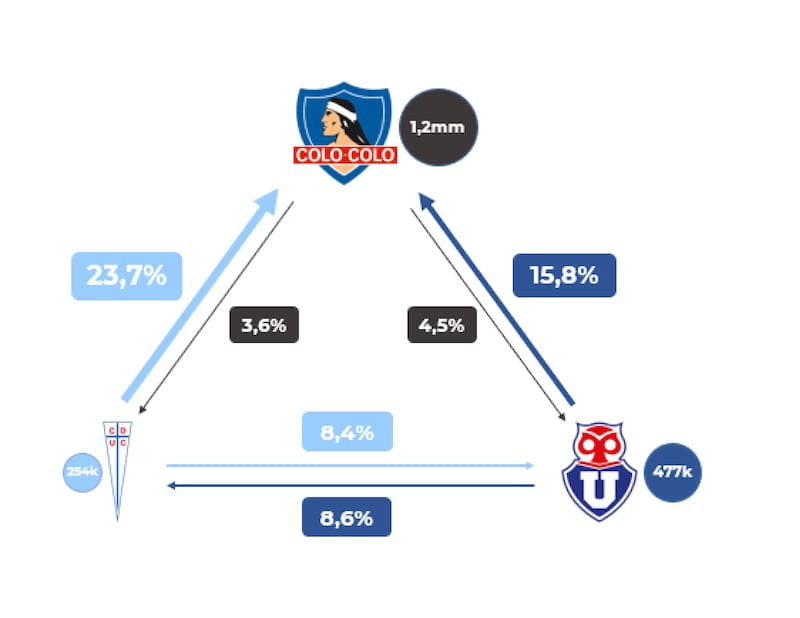 Al analizar la relación entre los seguidores de las cuentas de Colo Colo, U. de Chile y U. Católica, observan que el cruce entre todas las cuentas es bajo. “Lo anterior indicaría que se trata de comunidades distantes, probablemente, construidas desde una rivalidad deportiva”, sostiene Munita.