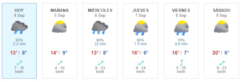 Según la Dirección Meteorológica de Chile (DMC), Santiago registraría lluvias el miércoles y jueves, El portal especializado Meteored por su parte señala que hoy también podría haber lluvias, las que se sumarían a las del miércoles, jueves e incluso el sábado. Mientras que algunos portales internacionales como The Weather Channel y AccuWeather, establecen precipitaciones durante prácticamente toda la semana.