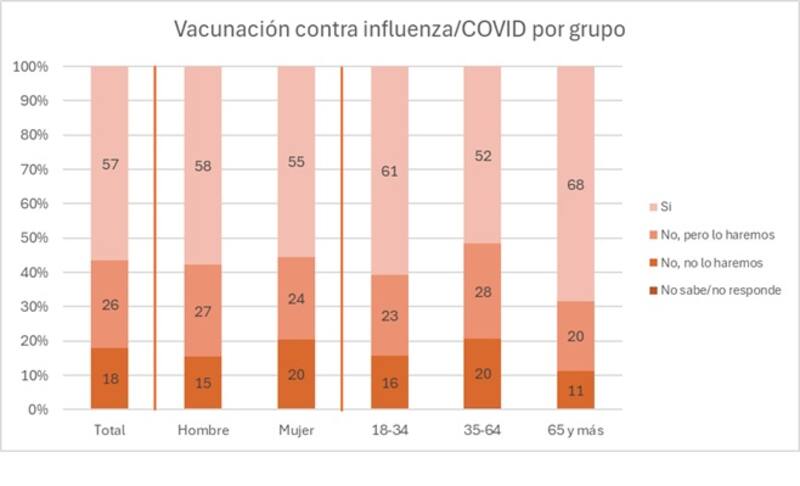 Según la consulta, el 57% declara haberse vacunado, en tanto que un 26% no lo ha hecho, pero piensa hacerlo y un 18% declara que no lo hará. “Este 18% representa un grupo significativo, y los datos del GPS permiten observar ciertos patrones: esta decisión se concentra especialmente en mujeres y personas entre 35 y 64 años”, explica Eduardo de la Fuente, socio director en Consultoría Social y de Mercado de Datavoz.