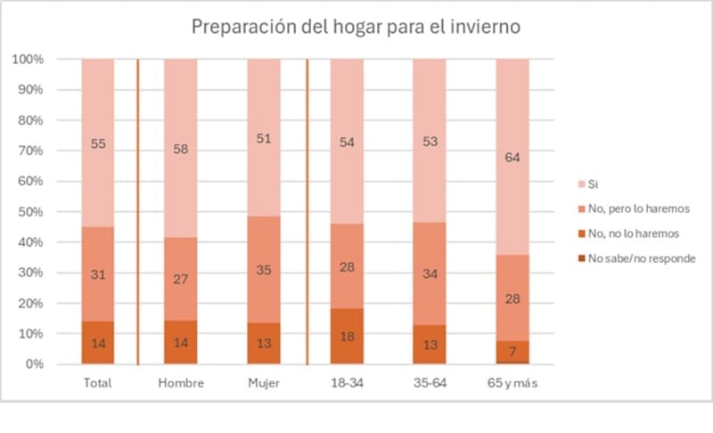 Un 55% declara haber hecho algo para preparar la casa para el invierno. Este porcentaje aumenta entre los hombres y personas de 65 años y más. Llama la atención, al igual que en la tabla anterior, que de todas formas hay un 15% que declara que no ha hecho nada y que tampoco piensa hacerlo. Las personas de 18 a 34 tienen el porcentaje más alto en esta categoría.