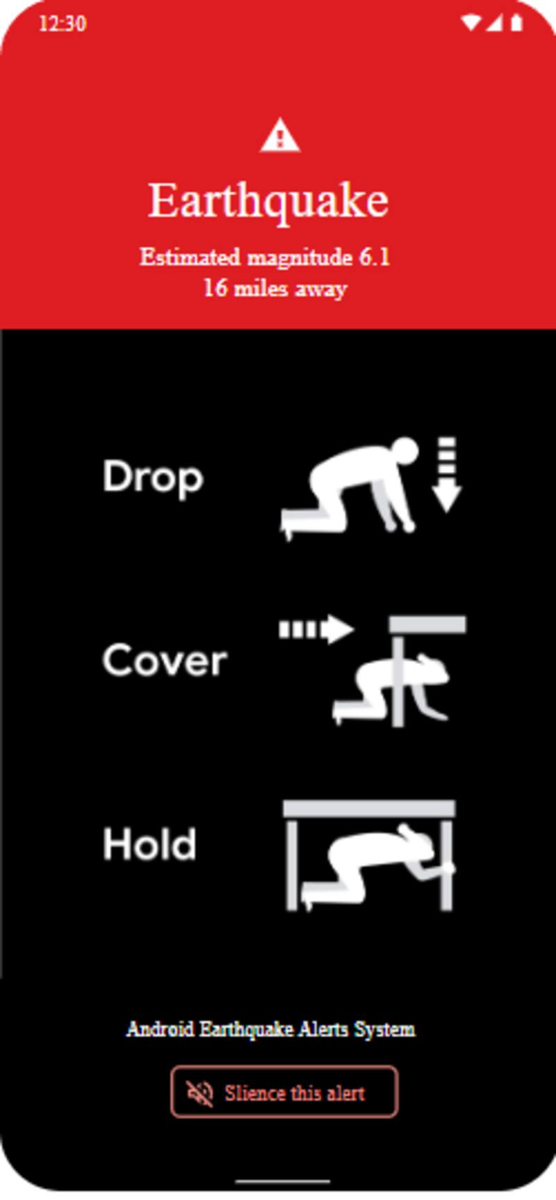 Android tiene dos tipos de notificaciones diseñados para alertar a los usuarios de un terremoto. Ambos tipos de alertas se envían solo en caso de terremotos de magnitud 4,5 o superior.