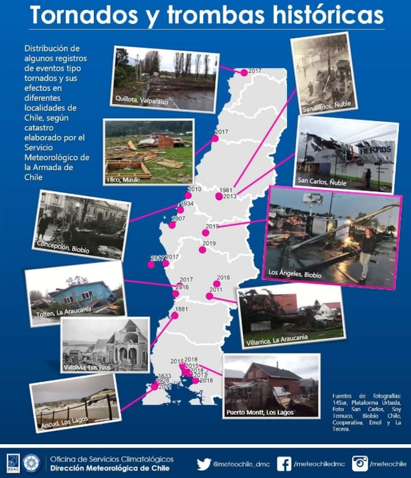 Según el registro de la Armada, se han documentado tornados y trombas marinas en Arauco, Vegas del Itata, Ancud, Villarrica, San Carlos, Puerto Montt, Puerto Varas, Toltén, Isla Mocha, San Pedro de Quillota, Theodoro Schmidt, Llico, Los Alerces (Puerto Montt), Los Ángeles y Talcahuano.