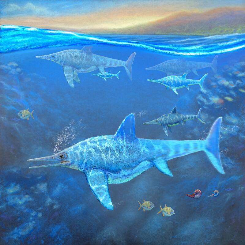 Se sabe que los ictiosaurios fueron reptiles marinos que vivieron desde el Triásico temprano hasta el Cretácico tardío, hace entre 250 y 93 millones de años, y se distribuyeron en distintas partes del mundo. A pesar de no estar relacionados con los delfines, los ictiosaurios compartían un plan corporal similar con dos aletas frontales, dos aletas traseras, una aleta dorsal y una aleta caudal para propulsarse en el agua.