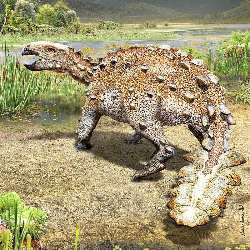 Sergio Soto y Alexander Vargas, de la Facultad de Ciencias de la U. de Chile, estuvieron a cargo de la investigación. Publicado en Nature y destacado en su portada, muestra que a diferencia de todos los dinosaurios conocidos a la fecha, poseía un arma caudal única que recuerda a un macuahuitl (arma similar a una espada) hecha de una “fronda” de siete o más pares de osteodermos (placa ósea que se encuentra en la piel o escama de los animales) conectados en forma de púas.