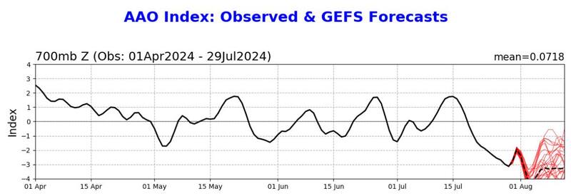 La proyección es que ese índice llegue a -4,3°, como muestra el gráfico de abajo. La baja, explica el climatólogo, está relacionada con el debilitamiento del vórtice polar y el denominado calentamiento estratosférico súbito.