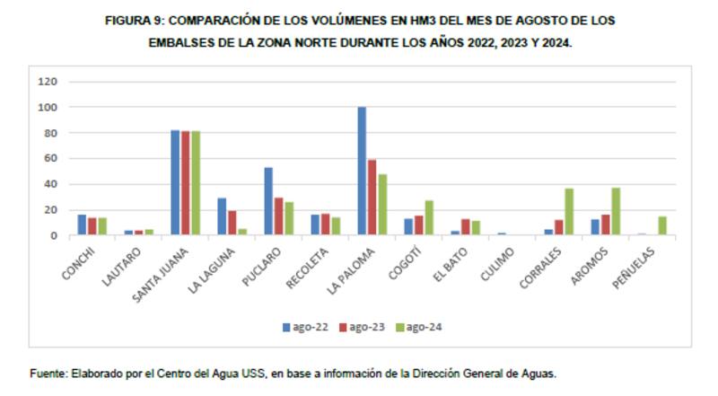 El Centro del Agua USS, que elaboró este apartado del Informe Hidroclimático, destaca el caso del embalse Peñuelas, ubicado en la Región de Valparaíso, que alcanzó un 15% de su capacidad, aumentando su volumen en más de 63 veces respecto a agosto de 2023, y en un 60% respecto al nivel presentado tras las lluvias de junio. Con esto, llegó a una capacidad de 14,51 hm3, lo que no se veía desde 2017.